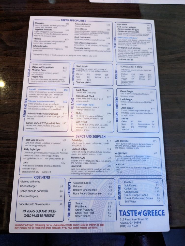 Taste of Greece is a delightful spot in Midtown Atlanta known for its Greek cuisine. With a modern and clean ambiance, this restaurant offers a variety of mouth-watering dishes, including their famous gyro and chicken skewers. Customers rave about the delicious food, giving it a perfect score of 11/10. The menu features traditional Greek dishes like Dolmades, Tzatziki, and Hummus, as well as hot appetizers like Fried Calamari and Spanakopita. Breakfast options, such as Eggs Benedict and Greek Skillet, are available all day. The friendly staff and spacious interior make dining at Taste of Greece a pleasant experience. While they do not serve alcohol, customers can bring their own. Whether you're looking for a quick bite before a show or a relaxed meal with the family, Taste of Greece is a must-visit destination for authentic Greek flavors.